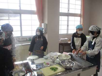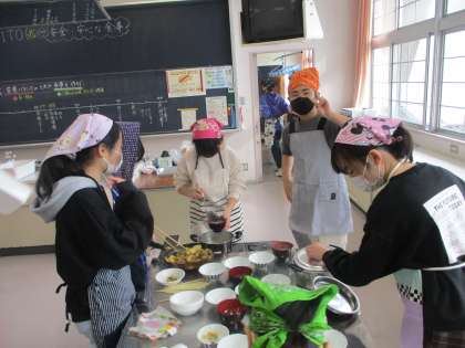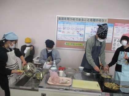 調理実習を行いました。自分から仕事を見付けたり、仲間と相談し合ったりしながら、調理する姿が見られました。