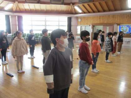 卒業を祝う会に向けて、学年で練習をしています。3年生の出し物は、合奏と合唱です。朝の時間や休み時間にも、友達同士で声をかけ合って練習をしています。