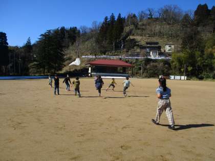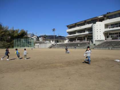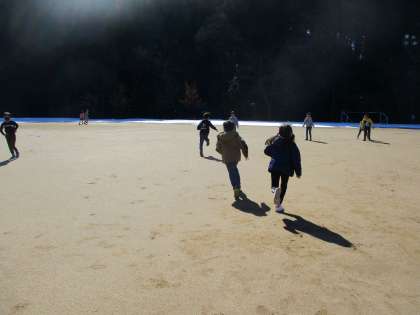 よく晴れて温かい日、休み時間にみんなでグラウンドへ行きました。思いっきり鬼ごっこをすることができて、楽しかったです。