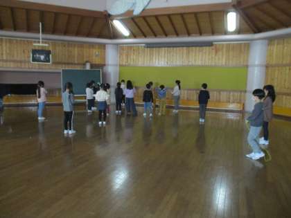 写真は、係活動で2回目のイベントに取り組んでいる様子です。今回取り組んだのは「なわとびバトル係」と「ふえおに・こおりおに係」の子供たちです。