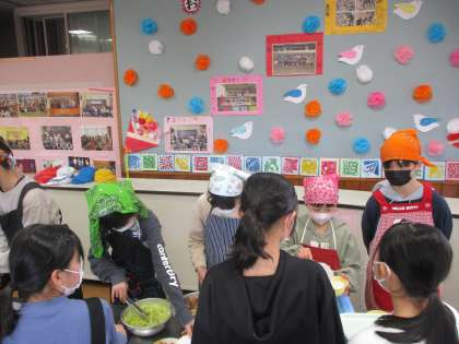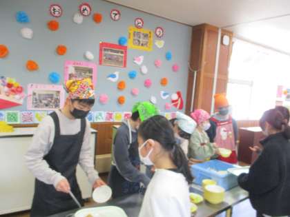 「今週で最後だから、みんなで給食当番をしよう」とのH君の呼びかけに、「エプ隊」が復活しました。特別な雰囲気の中、なんだか楽しそうに、そして協力し合って給食の準備を進めていました。