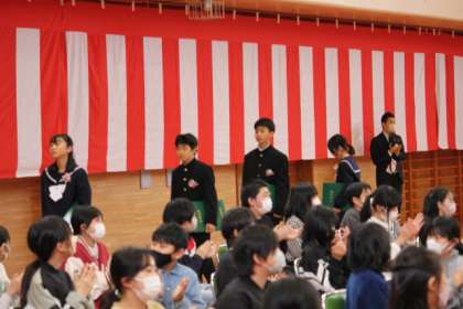 校長先生やPTA会長の方からのお話を心に刻んでいました。また、在校生からのお祝いの言葉がとても温かく、最高学年として過ごしてきた日々を思い出しながら聞いているようでした。