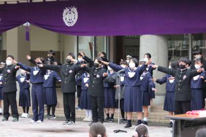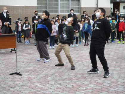 離校式では、児童会長が教職員・在校生・家族への感謝の言葉を堂々と述べました。また、卒業生みんなで考えたエール「GANBA!八尾小」「FAITO!八尾小」「もうすぐ150歳おめでとう!」と声を合わせました。お返しに5年生の代表から、お祝いのエールをもらいました。