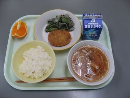 4月10日(月)今年度最初の給食が始まりました。献立は、ごはん・牛乳・豆とかぼちゃのコロッケ・よごし・沢煮椀・清見オレンジです。4時間目終了後には、「お腹空いたよ」という声が聞こえてきました。どのクラスでも、おかわりじゃんけんで盛り上がっていました。今年度も、おいしくて、安心・安全な給食を提供します。