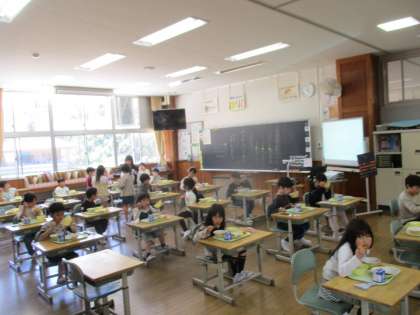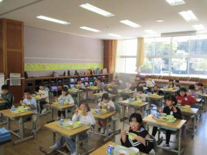 「1年前の今日は、給食なしで、早く帰ったんだよね…」と思わず言葉をもらすと、「え?」「そうだったっけ?」「もう忘れた!」などと言いながら、自分たちでてきぱきと準備を進め、おいしく給食を食べる2年生の子供たちでした。