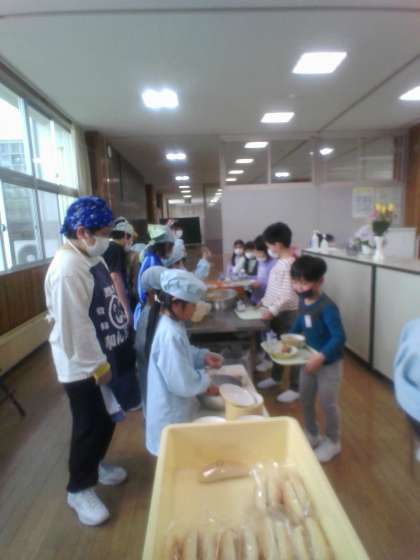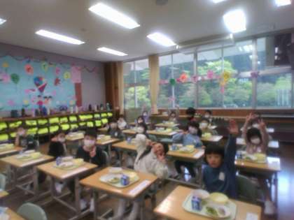 楽しみにしている給食の時間です。6年生のおにいさんおねえさんに手伝ってもらいながら給食の準備をしました。「のこさず食べると元気な体になるね」と話す子供たちでした。