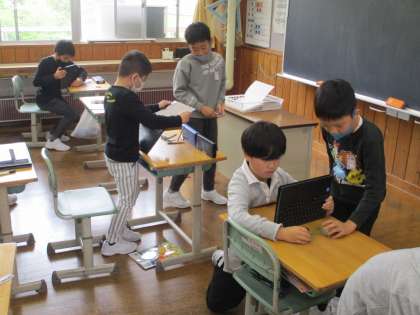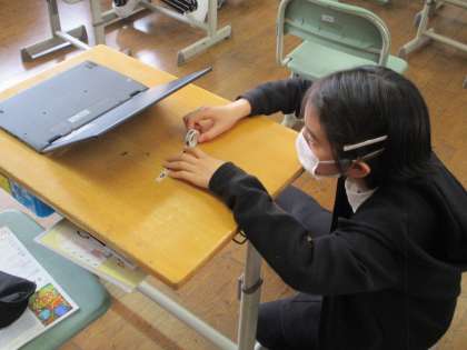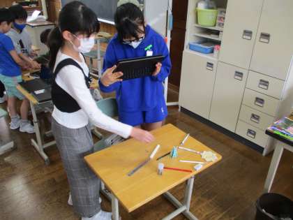 図工の時間に、クロムブックを使ってコマ撮り動画を作成しています。文房具等を少しずつ動かして撮影しました。友達とアイディアを出しながら楽しく活動しました。