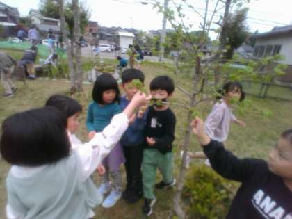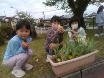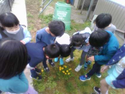 生活科の学習では、春見つけをしました。たんぽぽの指輪を作ったり、新芽を触ったりしました。「たんぽぽになぜ、ありがついているんだろう」「チューリップの花びらはどうして落ちていったんだろう」と疑問に思う子供たちでした。