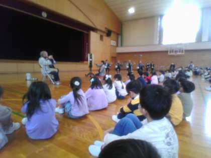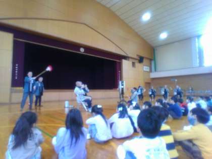 曳山囃子の鑑賞会が開かれました。笛や三味線、太鼓が体育館に鳴り響きました。「ほりきのみっつのようかんぼ!」「わっしょい!」と元気に声を出した子供たちでした。