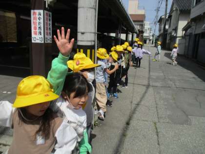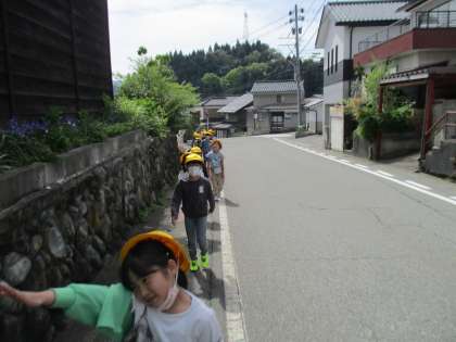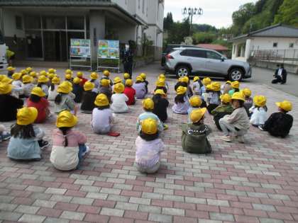グラウンドでの開講式の後、児童玄関前で警察の方からお話を聞いた後、実際に道路に出て練習しました。