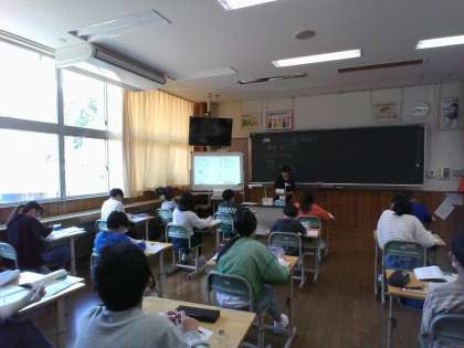 L字の立体の体積を求める方法を発表しました。ノートと箱を手に、上手に発表することができました。