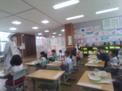 栄養職員の先生に今日の給食についてお話していただきました。メープルシロップがカエデの木から取れることに驚く子供たちでした。