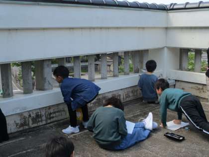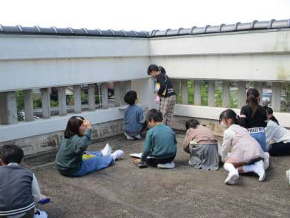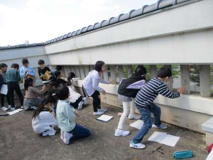 今日は屋上から何があるか観察しました。方位磁針を正しく使い、それぞれの方角を確認しました。