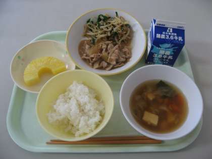 5月1日(月)今日の献立は、ごはん・牛乳・豚肉の生姜焼き・ナムル・中華スープ・パインアップルでした。ナムルに入っている「にら」は、元気のでる野菜と言われています。ビタミンB1が多く含まれて、疲労回復やスタミナアップに最適です。今日は、豚肉もあり、元気もりもりになる献立でした。今日もおいしくいただきました。