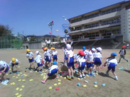 体育の時間に、玉入れの練習をしました。自分の色団の玉をかごに向かって一生懸命に投げる子供たちでした。