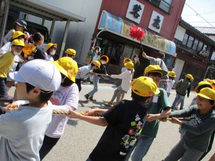 「ほりきのみっつのようかんぼう」の掛け声をきっかけとして綱を曳きました。元気に「わっしょい わっしょい」と声を出しながら曳く子供たち。町の伝統文化に親しみ楽しんでいました。