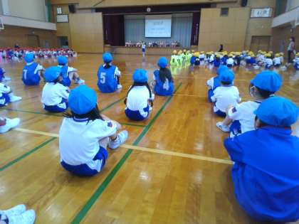 児童会から、スローガンが発表されました。スローガンは、「全力!協力!あきらめない!みんなでやりきる運動会」です。