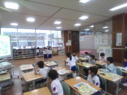 元気な挨拶について、みんなで考えました。「挨拶をすると、自分も相手もパワーがもらえるね」と、挨拶をするといい気持ちや嬉しい気持ちになることを話し合いました。「おはようございます」とさわやかな挨拶を実践しました。