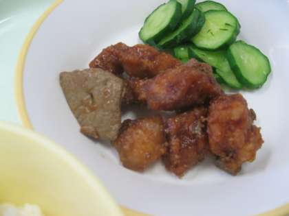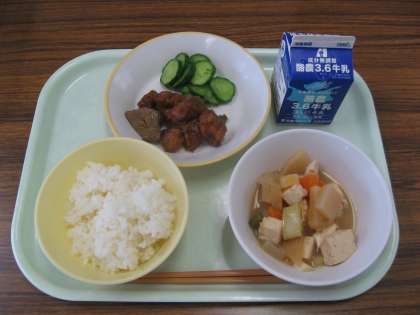 5月9日(火)今日の献立は、ごはん・牛乳・豚肉とレバーの揚げからめ・きゅうりもみ・ごまけんちんでした。レバーは、苦手な児童も多かったですが、残食はほとんどありませんでした。4年生では、レバーのおかわりじゃんけんで盛り上がっていました。レバーは、貧血予防、美肌効果、風邪予防などに良い栄養が含まれています。今日もおいしくいただきました。