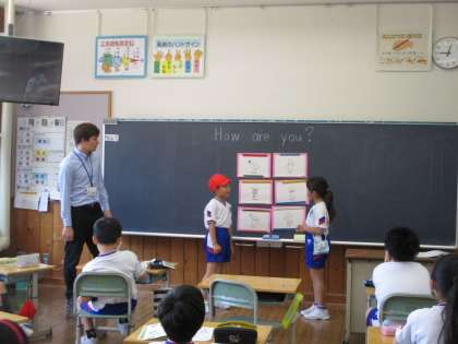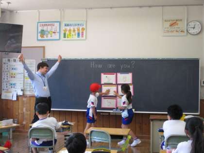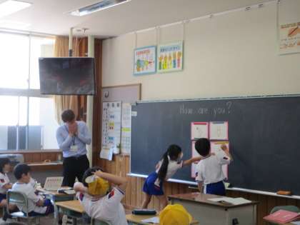 外国語活動では相手の様子を尋ねたり、応えたりするやりとりをしています。相手の気持ちに当てはまるイラストをタッチする対決をしました。