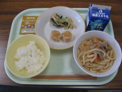 5月15日(月)今日の献立は、ごはん・牛乳・かやくうどん・にんじんシューマイ・おひたし・野菜ふりかけでした。児童たちからは、「かやくうどんって、火薬?」「爆発する?」と質問されました。かやくうどんの「かやく」とは、そばやうどんに数種類の具をのせたのを「かやくそば、かやくうどん」という説があります。うどんの原材料のクイズをしました。三つの原材料を覚えているか聞いてみてください。今日もおいしくいただきました。