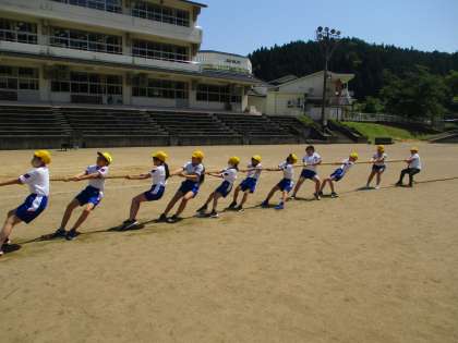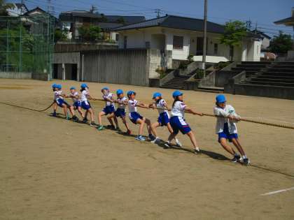 グラウンドで実際に綱を引いて練習をしました。体育館で練習したことを生かし、体全体で綱を引く子供たちの姿が見られました。グラウンド全体に子供たちの元気なかけ声が響き、本番がますます楽しみになりました。