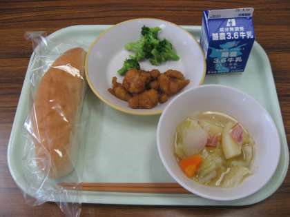 5月18日(木)今日の献立は、米粉コッペパン・牛乳・鶏肉ひよこ豆のカレー風味・ゆでブロッコリー・野菜のスープ煮でした。ひよこ豆は、給食によく登場します。ひよこ豆は、形がひよこの頭の部分に似ていることから、「ひよこ豆」という名前が付きました。今日も暑かったですが、カレーのスパイスが効いていて、食欲をそそりました。午後からも、運動会の練習頑張れそうですね。今日もおいしくいただきました。