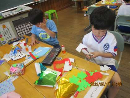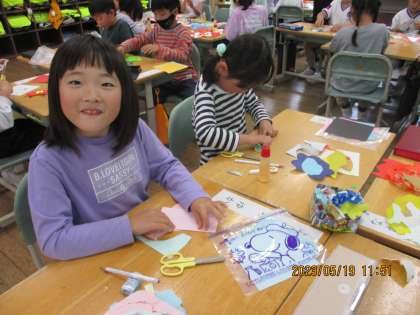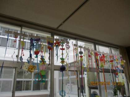 「ちょきちょきかざり」の学習では、折り紙を折ったり切ったりして、お気に入りの飾りを作りました。長く長くつなげた飾りや細かい模様をちりばめた飾りなど、いろいろな飾りが完成しました。