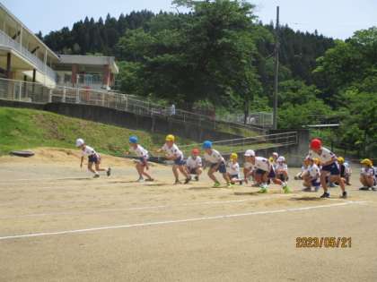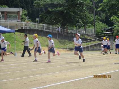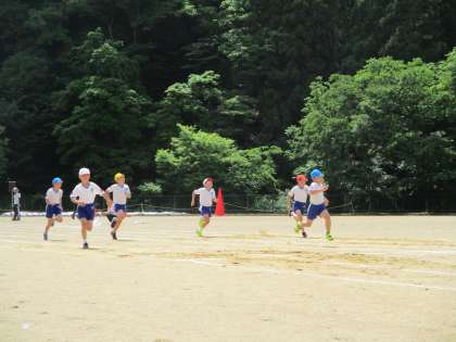 4年生の最初の競技は100m走でした。これまでの朝のトレーニングで、毎日スタートを中心に練習してきました。今年は、タイム順で走っているので、どの組も接戦でした。最後まで諦めず全力で走りきる姿がとても素敵でした。