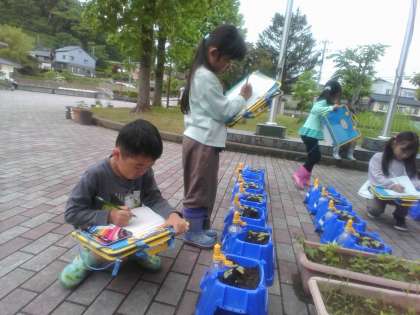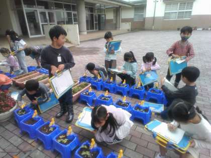 あさがおの芽が出てきました。今日は葉の様子を観察しました。「りぼんみたいな形だね」「けしごむくらいの大きさだよ」とワークシートに分かったことを書き込む子供たちでした。
