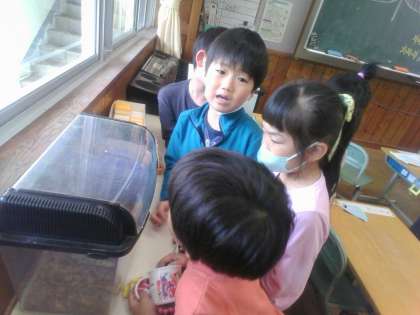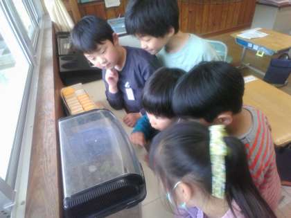 「赤ちゃんかまきりは、何を食べるのかな」と図鑑で調べる子供たちです。