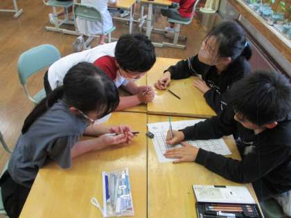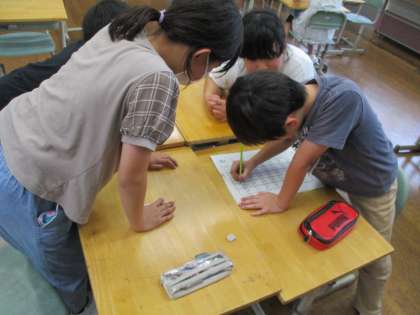 給食委員会の「食べ物しりとり」にクラスのみんなで挑戦しました。グループごとに相談しながら食品や給食のメニューをしりとりで繋ぎました。