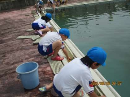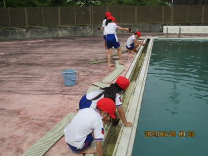 今日は、これから始まる水泳学習のために、プールの側溝を清掃しました。側溝のふたを取ると、1年間の汚れがこびりついていました。長い溝をたわしでこするのは、とても大変でしたが、みんなで協力し合って、一生懸命取り組みました。
