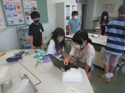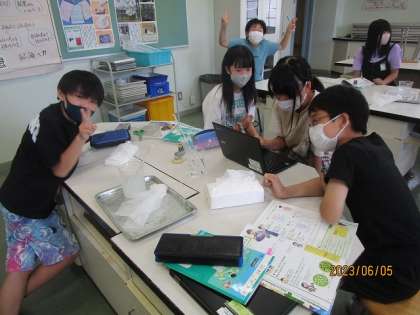 色の変化を比べた6年生は、「すごーい!」「予想通りだけれど、おどろいた!」と感想を語り合いました。