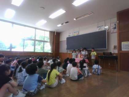 2年生の子供たちに、かみしばいの読み聞かせをしてもらいました。たくさん笑い、和やかな雰囲気でした。最後には、みんなの前で「面白かったです。」と感想を伝えられた1年生でした。