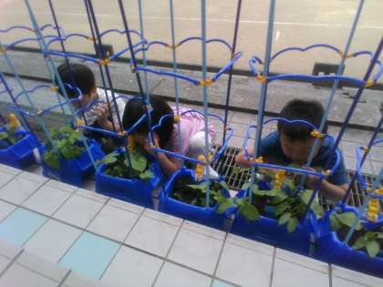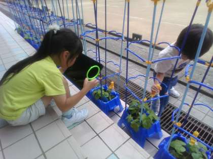 生活科の学習では、あさがおの観察をしました。「葉が大きくなったよ。」「さわるとざらざらしているよ。」「いい香りがするよ。」と目や手、鼻など五感を生かして、観察したことをワークシートにまとめました。