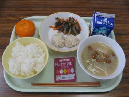 6月13日(火)今日の献立は、ごはん・牛乳・えびパオツ・もずくのチャプチェ・なめこ汁・しそかつおふりかけ・冷凍みかんでした。海藻は苦手な人も多い食材ですが、もずくのチャプチェは人気があります。もずくを含む海藻類は、からだの調子を整えるビタミン類が豊富です。ご家庭でも取り入れてみてください。今日もおいしくいただきました。