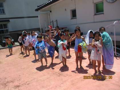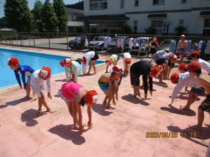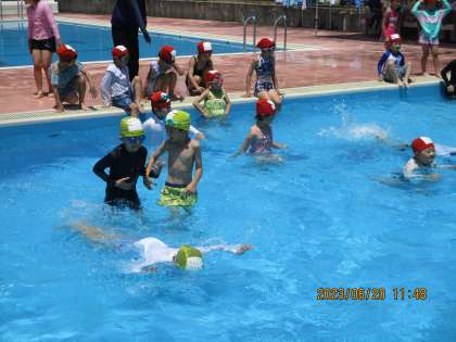 初めてのプール学習でした。みんなでうずを作ったり、歩いたり泳いだりしました。振り返りでは、「水が冷たいね」「思ったより深いよ」「友達と遊ぶと楽しいね」「『かぶとむし』の約束事を守れてうれしかったよ」と話す子供たちです。