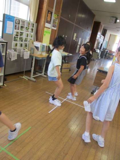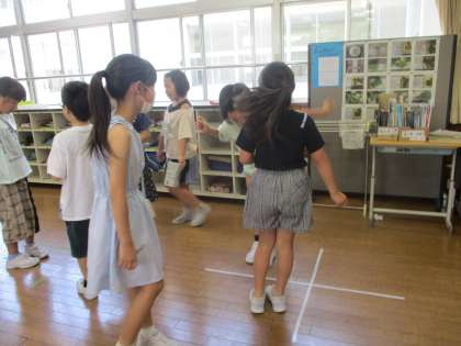 昨年の音楽科の授業で盛り上がった「あんたがたどこさ」を口ずさむ姿がありました。そこで、あんたがたどこさ用にテープを貼ると、子供たちが集まって互いに歌を歌いながら楽しんでいました。