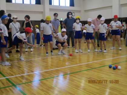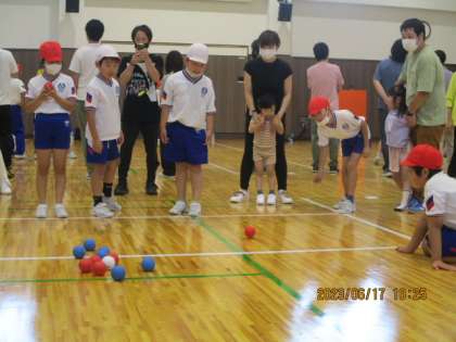 すぐに勝敗が決まるので、15分間で3〜4セットほどゲームすることができ、だんだん慣れてくると、ボールの投げ方や攻め方にも工夫が見られるようになりました。みんなでボールの行方を真剣なまなざしで見つめています。