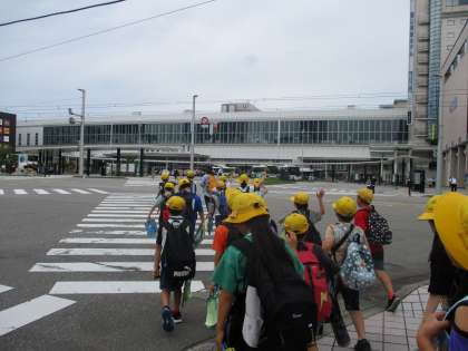 富山駅には徒歩で向かいました。「バスが!4台もある!」子供たちは大きな驚きだったようです。たくさんの交通量に興味津々でした。