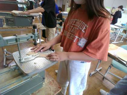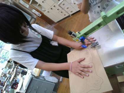 下絵の線にそって糸ノコで板を切りました。練習の成果を発揮して、板を動かしながら丁寧に切りました。