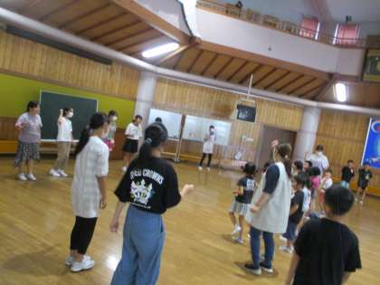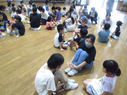 八尾保育所の子供たちと、竜の子ホールで交流しました。5松の子供たちの目当ては「自分の名前を覚えてもらうこと」と「保育所の子の名前を覚えること」です。最初に自己紹介のゲームをしました。お互いに緊張した様子でしたが、だんだん慣れていきました。
