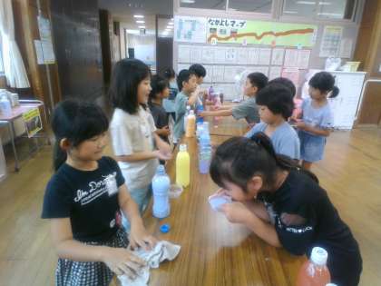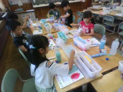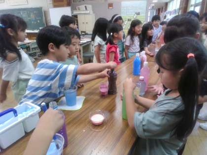 色水遊びをしました。「世界で一つだけのジュースを作ろう」と自分たちで目当てを決めて楽しく活動しました。ジュース屋さんを開くと、2年生のお客さんも来てくれました。「友達にジュースの作り方を教わったよ」「このジュースが人気だったよ」「お客さんにたくさん売ってうれしかったよ」と話す子供たちでした。