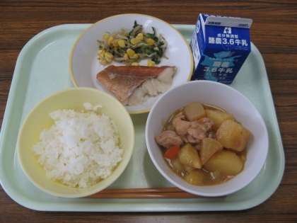 6月27日(火)今日の献立は、ごはん・牛乳・赤魚の塩焼き・チンゲンサイソテー・鶏肉とじゃがいものごま煮でした。ごまは、皮の色によって、白、黒、金の大きく三つに分けられますが、世界には色や形、大きさなど様々なごまがあり、その数は約3,000種といわれています。今日のごまは、白ごまを使用しました。ごまの香ばしい風味が感じられ、おいしくいただきました。