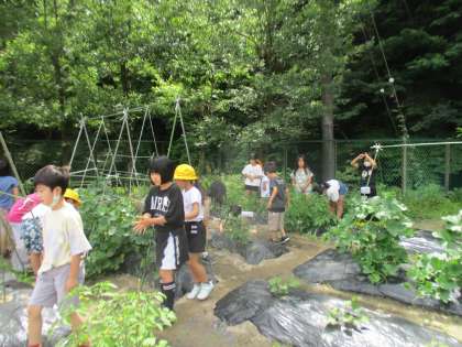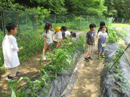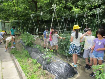学校の畑では、色団ごとに野菜を植えており、だんだん大きくなってきています。