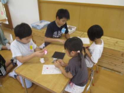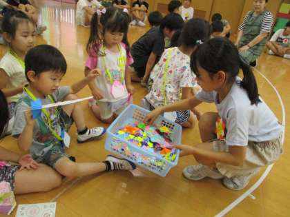 保育所の子供たちはスタンプラリーをしながらそれぞれのゲームを楽しんでくれました。5年生は、「同じ目線で話す」「簡単な言葉で話しかける」を意識して関わりました。