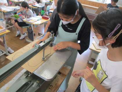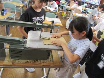 電動糸のこを使って白板の形や飾りを切りました。曲線やギザギザの線を切るのは難しいですが、先に切った人が次に切る人を手伝うなど、協力しながら切ることができました。