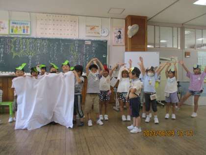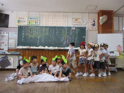 おおきなかぶの音読劇の練習をしています。「手振りを付けたり、表情を変えたりするともっと伝わるよ」「場面によって声をどんどん大きくしよう」と意見を出し合っている子供たちです。