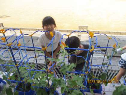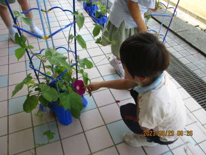 朝一番に「あさがおの花が咲いているよ」と気付いた子が教えてくれました。紫やうすピンクの花に大興奮の子供たちです。あさがおに関する新しい発見を集めて、あさがお新聞を書きました。